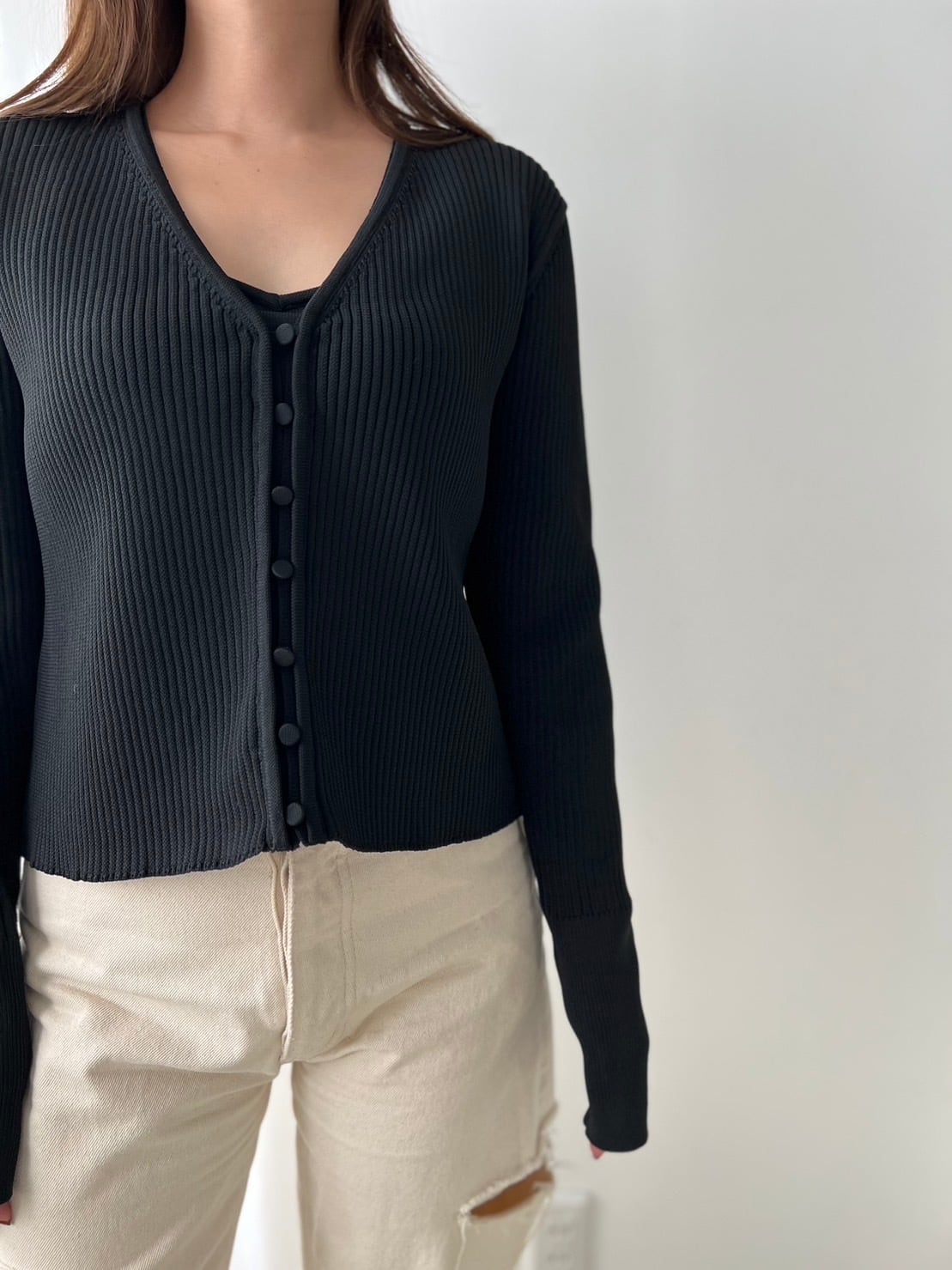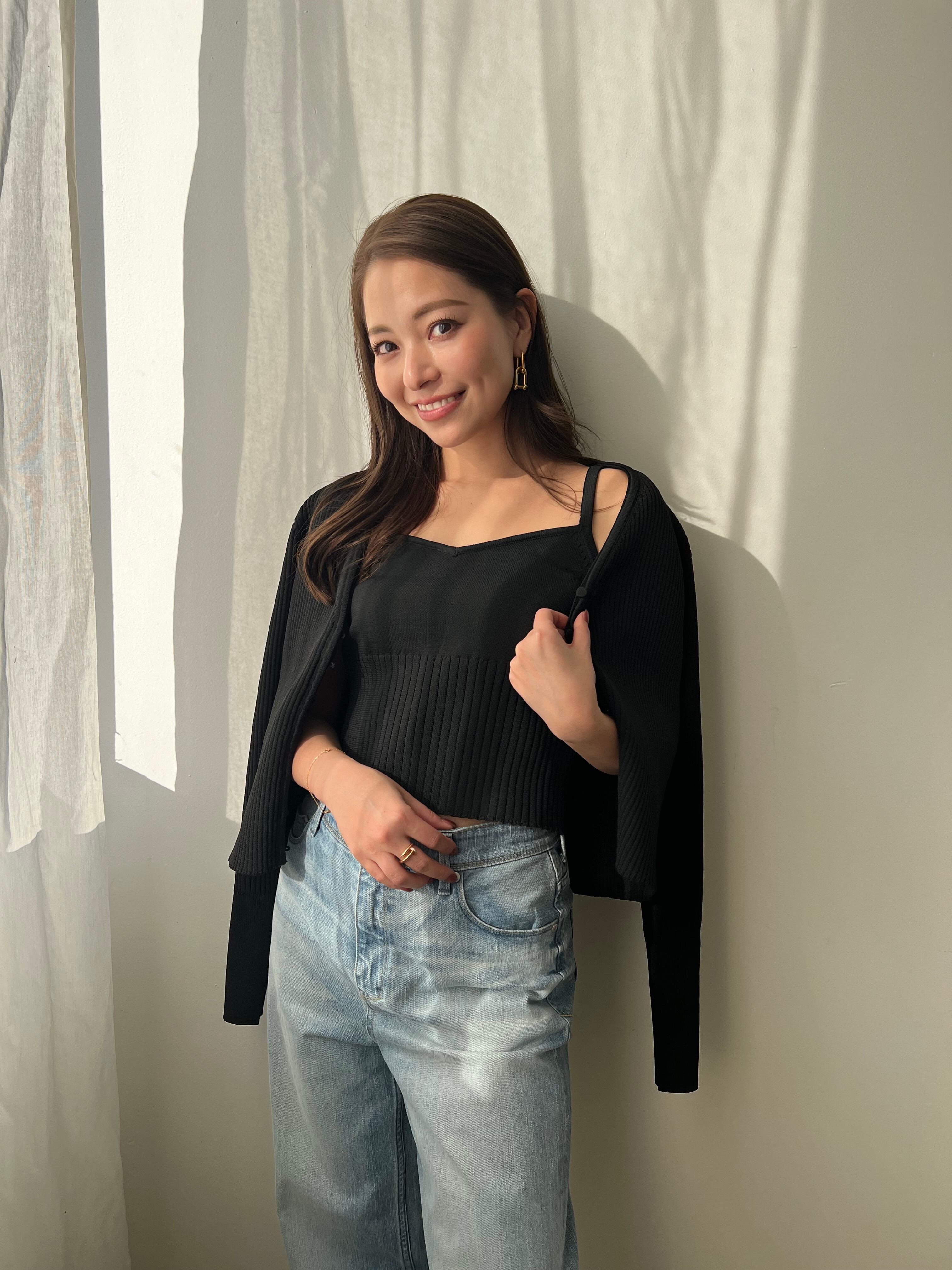 ショート丈のニットカーディガンに同素材のビスチェがセットになったアンサンブル。