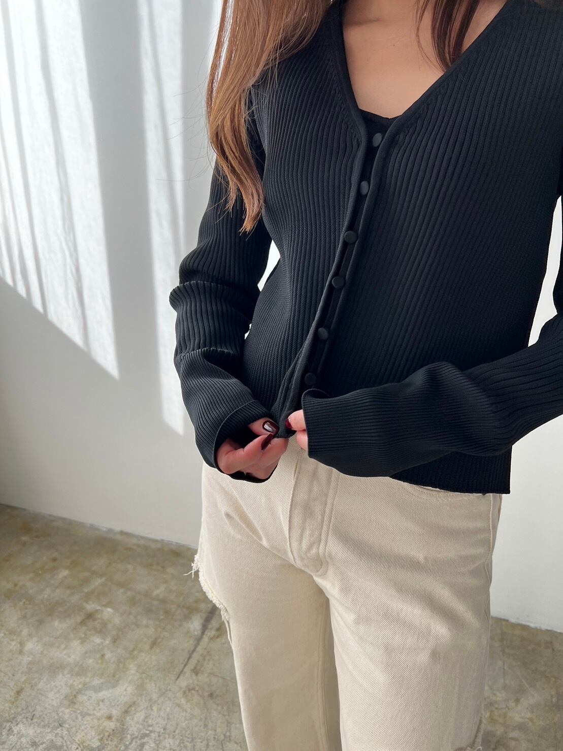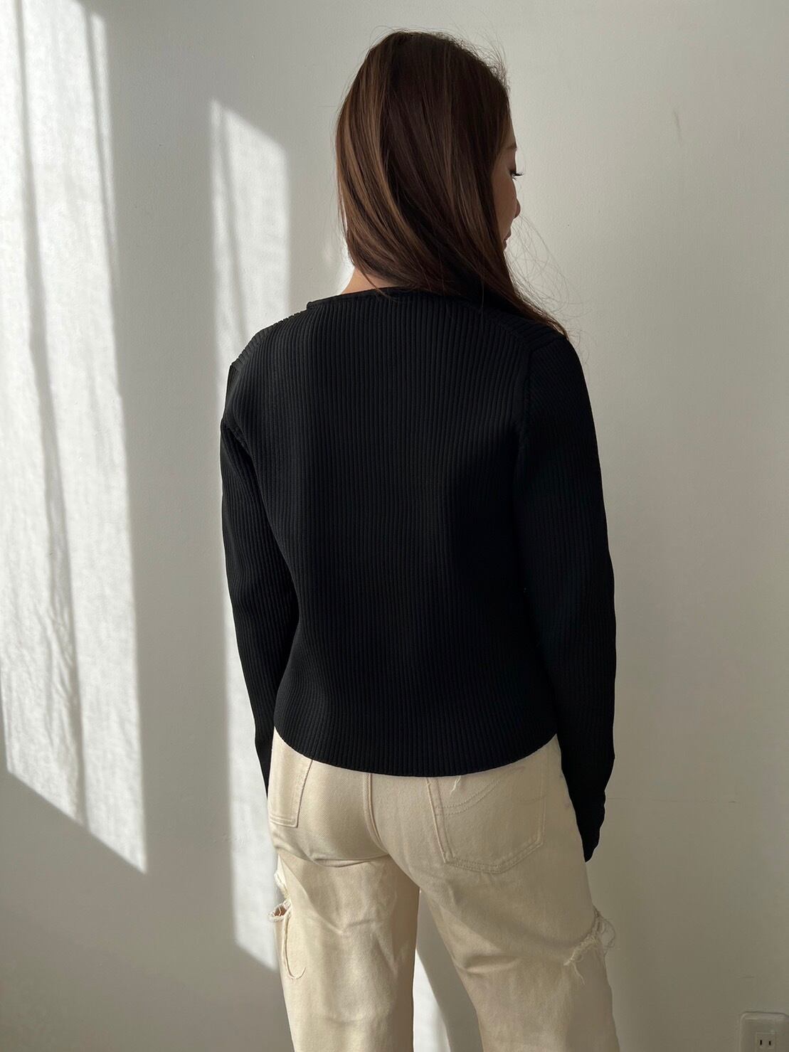 袖口リブは編地を変え、あえて短めに設定した着丈はより大人な印象に。