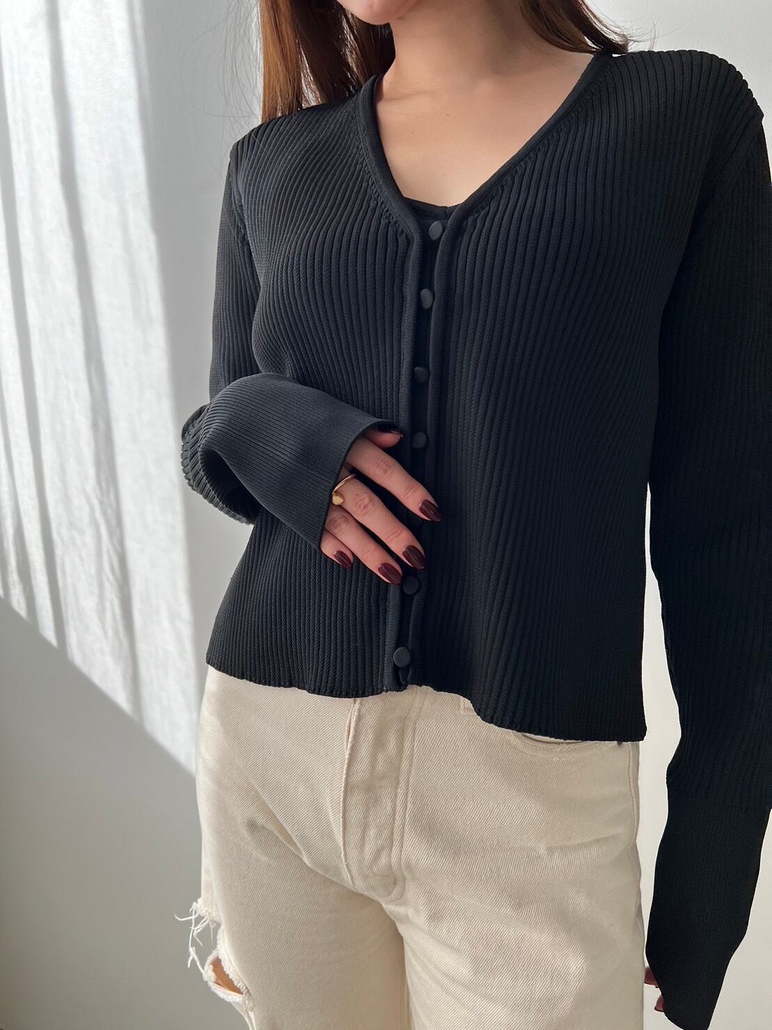 カーディガンは、華奢な衿ぐりの仕様に、フロントにはくるみボタンを施し、繊細に仕上げました。