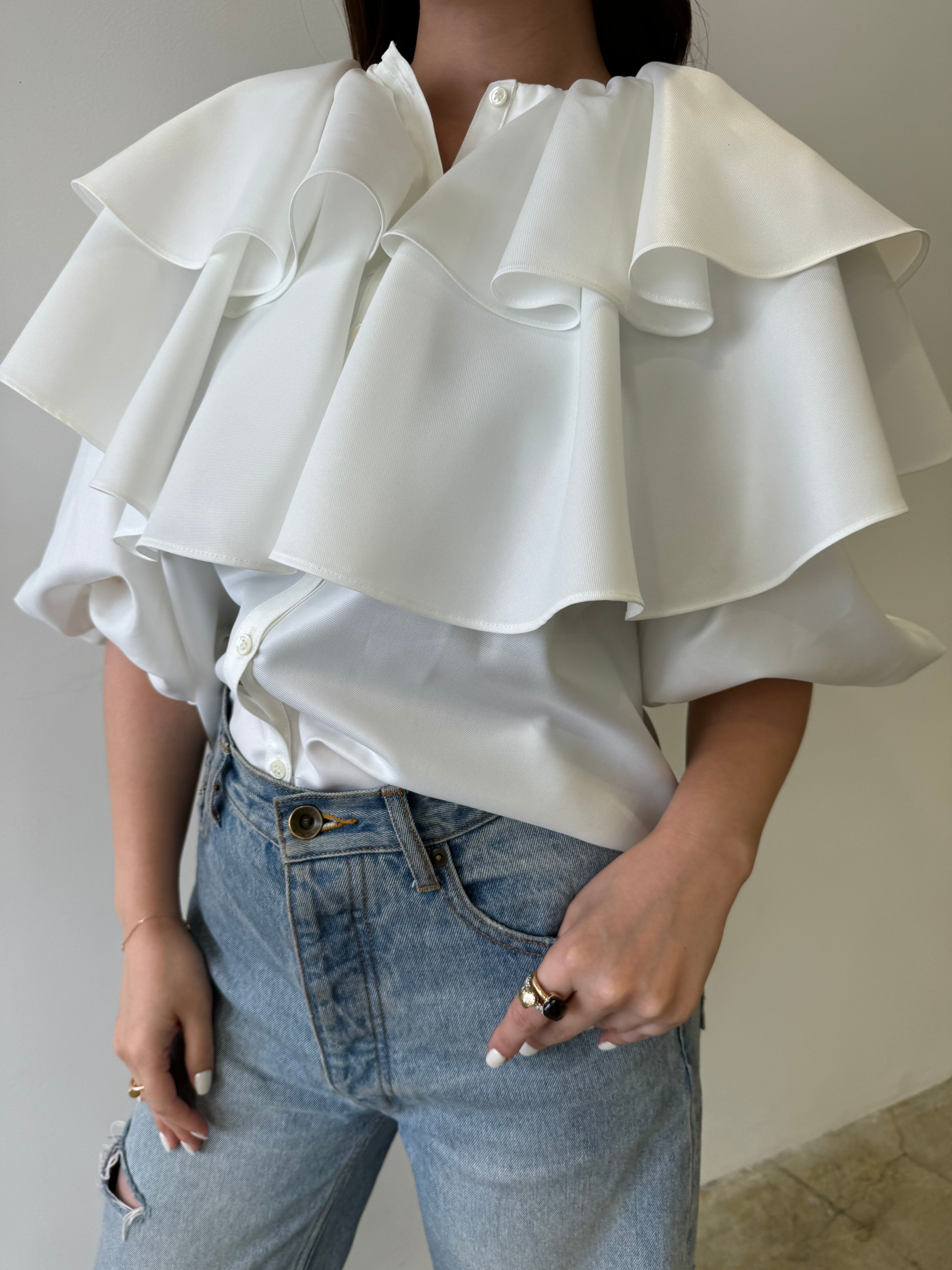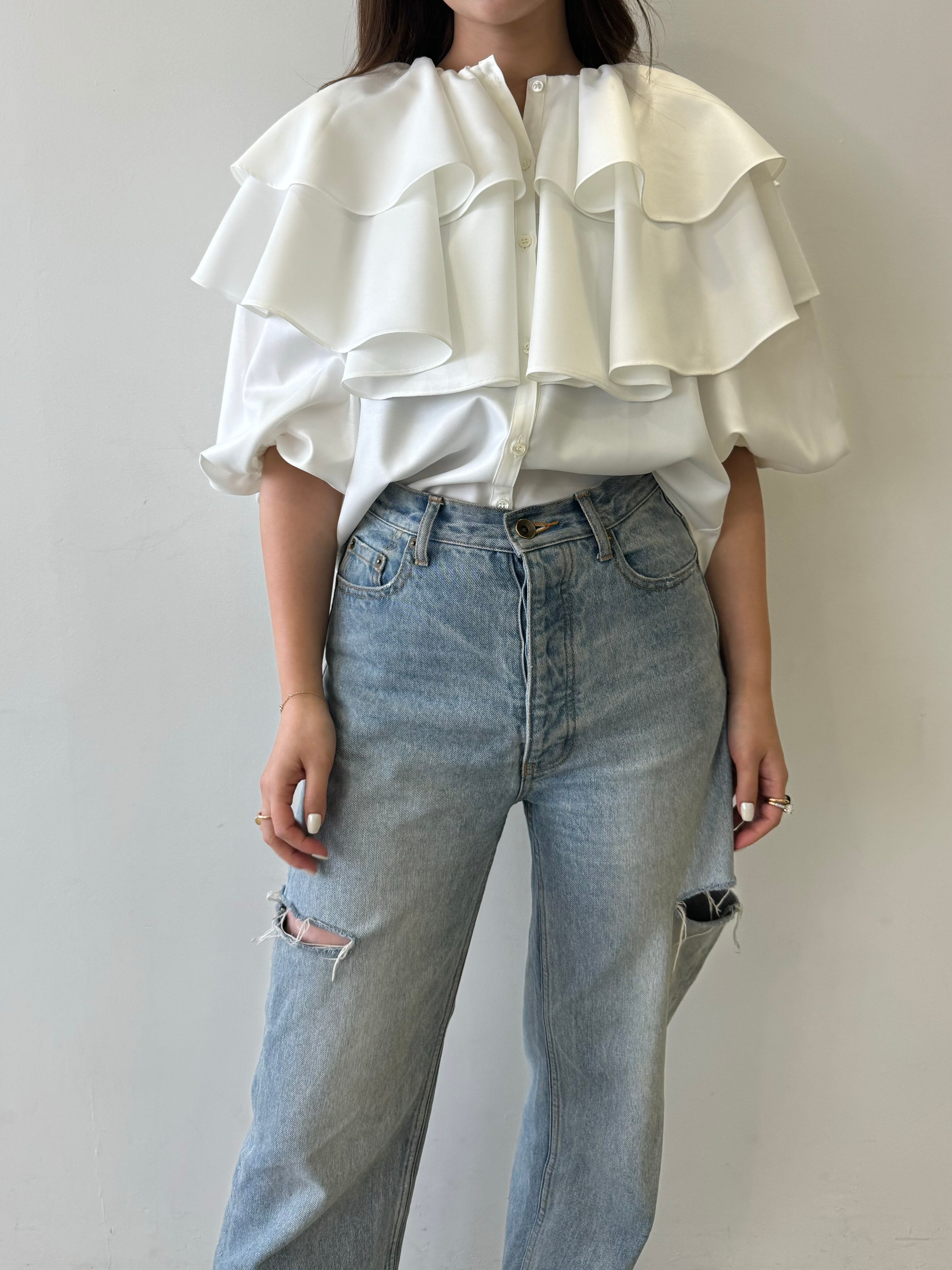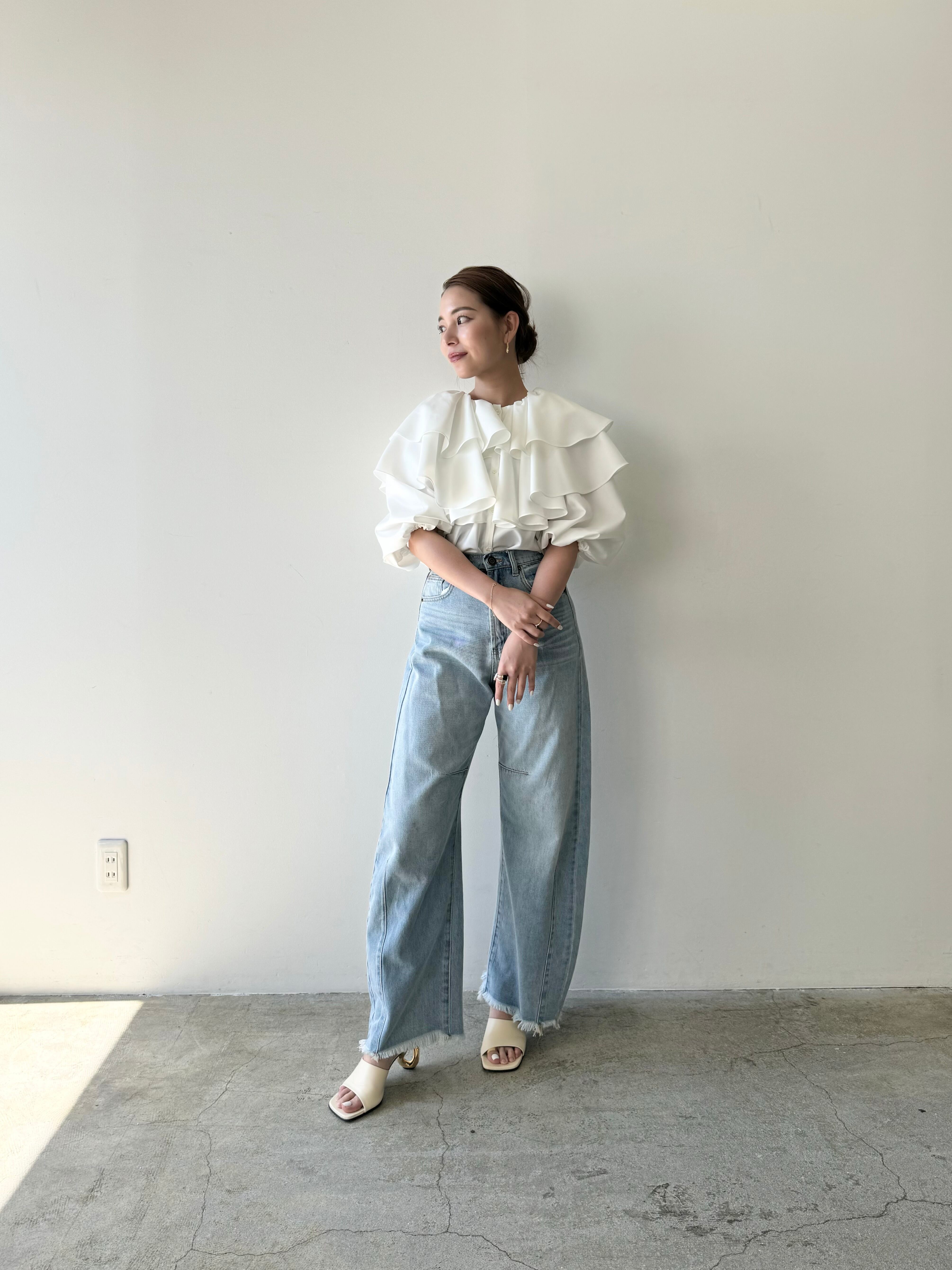 このディテールが、ブラウス全体のシルエットに柔らかさを加え、女性らしい優しさを演出。