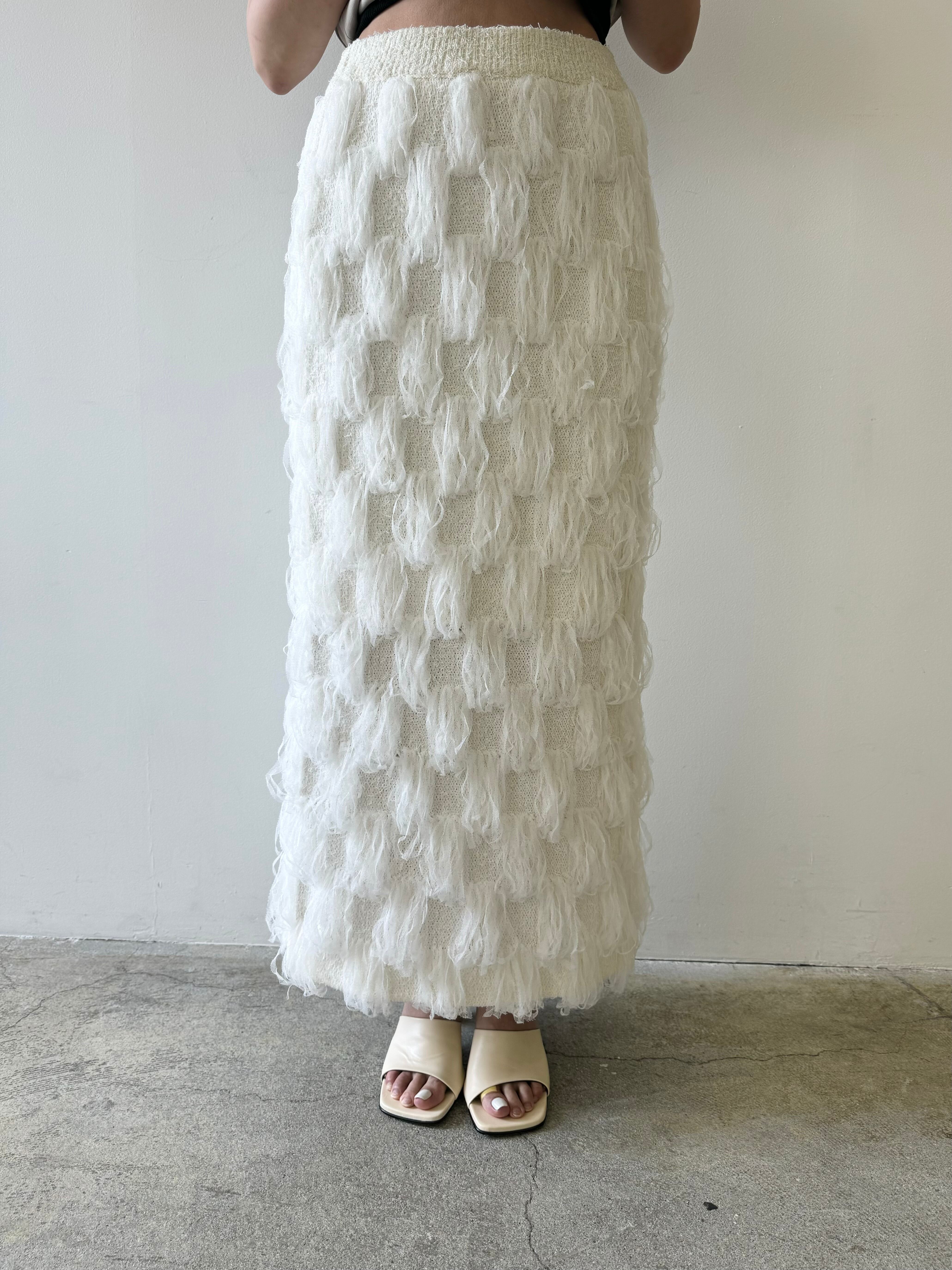 ホワイトとブラックの2色展開で、フェミニンにもモードにも着こなせる大活躍間違いなしのニットスカートです。