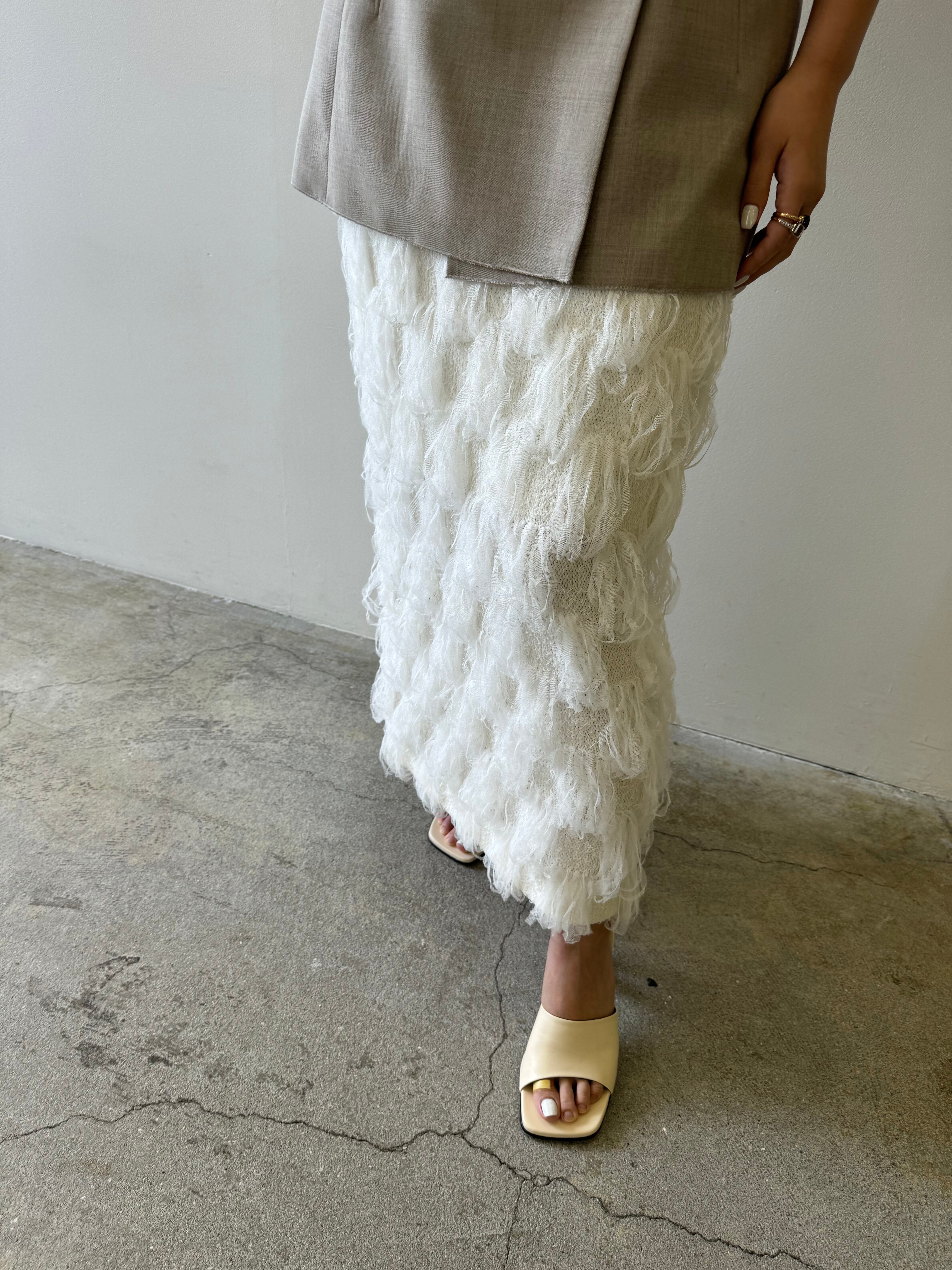 シンプルなTシャツと合わせるだけでも贅沢に華やぐスカートです。