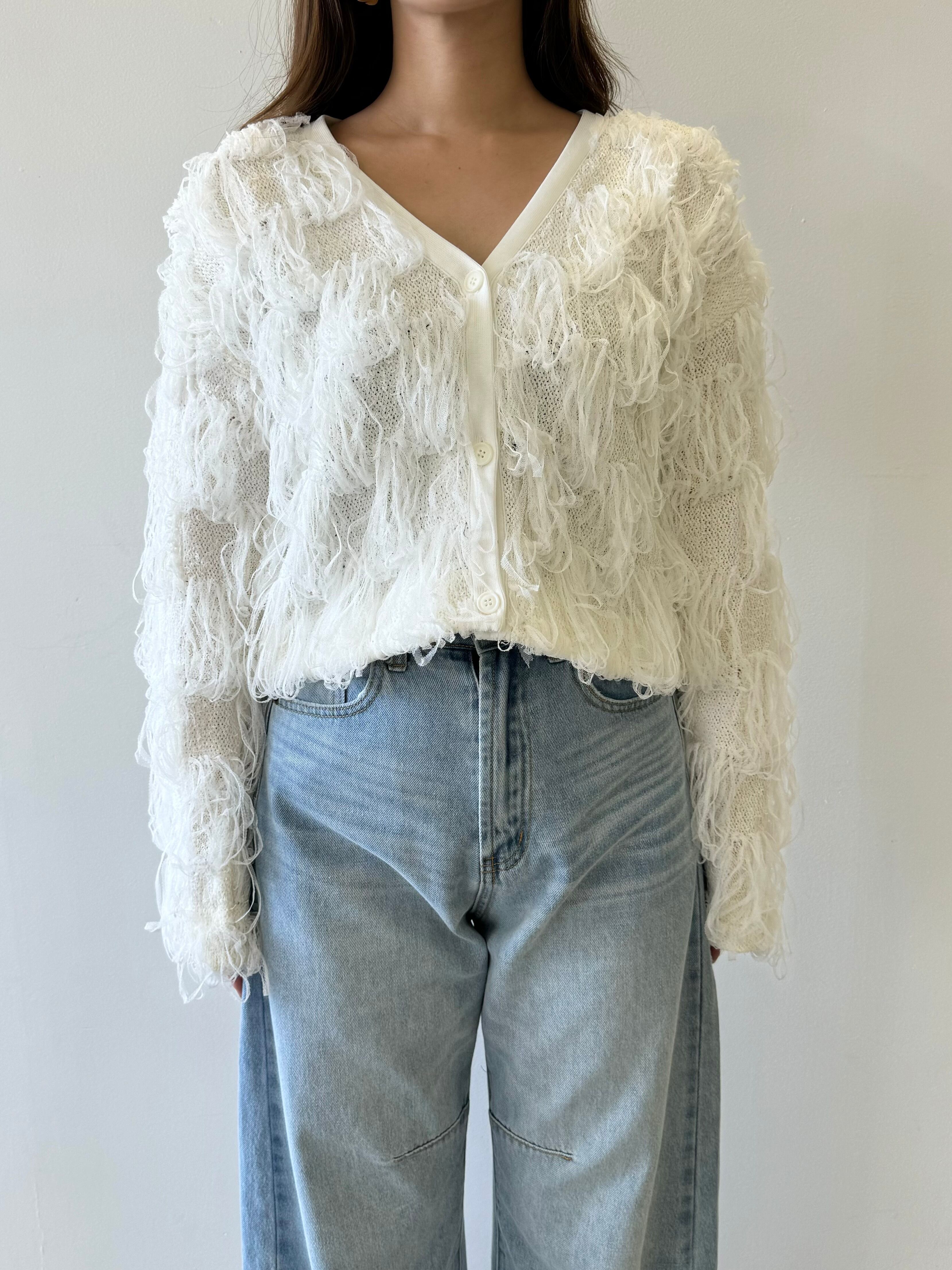リボンテープのような糸を使用した華やかなニットカーディガン。